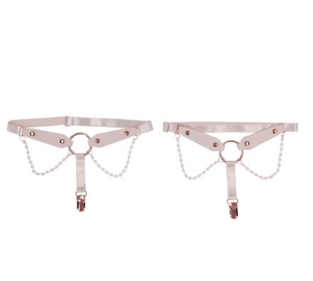 Sweet, sexy, and impossible to ignore, these luscious Peaches N CreaMe Garters are made to turn heads and raise pulses. Crafted from soft faux leather and adorned with delicate pearl strands, a gleaming rose gold O Ring, and functional garter clips, they blend elegance with irresistible edge. Fully adjustable for a perfect fit, they wrap your thighs like a sensual secret, tempting anyone within view to take a closer look or a daring bite. The secure clips hold your thigh highs in place, letting you strut with confidence and command attention at every step. Seduce with style, tease with power, once they catch a glimpse, theyll follow your lead without question. Features: Fits thighs 18 – 26 (45cm – 66m) Lustrous pearl chains add a soft, flirtatious edge Built-in clip to secure stocking placement