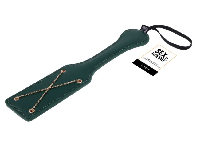 Leave a markin more ways than one. The Indica Chain Impressions Paddle features a luxe gold chain embedded in emerald green faux leather, creating a striking texture that may leave a delicate imprint with each spank. Delivering a satisfying thud with just a touch of sting, this paddle is as beautiful as it is bold. Display it proudly or keep it close for those moments when a little discipline turns into a lot of fun.Features:Gold chain inlay for textured impact and possible imprintFaux leather paddle in rich emerald greenBalanced design for comfortable handling and controlled play
