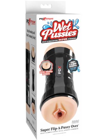 Get ready for double the fun with the Wet Pussies Super Flip-A-Pussy Over! This dual-ended stroker features a realistic pussy and ass stroker on both ends to make sure you get exactly what you came for. Both sides are self-lubricating, so all it takes is a little water, and your stroker turns into a pleasure zone of slippery orgasmic fun x 2!Designed with realistic details and a stimulating pleasure tunnel, you can be sure that this stroker LOOKS and FEELS better than the real thing! The ergonomic case protects your stroker and acts as discreet storage. It also features our EZ-Grip design for comfort and easy handling.So stop dreaming about pussy and ass and start creaming in them today!The interior sleeve is removable for easy cleanup with antibacterial cleaner and warm water. Pat dry, then air-dry completely before storing.