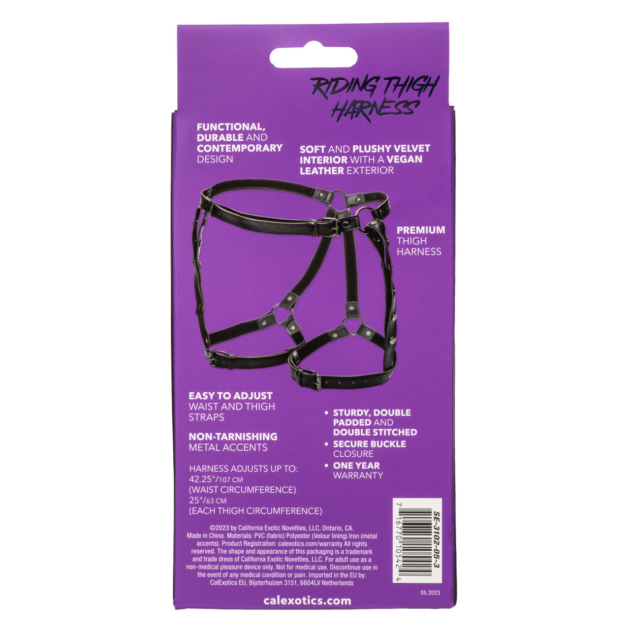 Euphoria Riding Thigh Harness from California Exotic Novelties. Indulge in the thrill of the Euphoria Collection Riding Thigh Harness, a premium harness designed for an exhilarating experience. Whether you are looking to spice up your intimate moments or add a unique touch to your festival outfits, this riding style harness is the perfect choice to make a bold statement. The easy to adjust waist and thigh straps with secure buckle closures ensure a comfortable and secure fit, allowing you to focus on pleasure and style without any distractions. The functional, durable, and contemporary design ensures long lasting use and maximum enjoyment. Indulge in the luxurious feel of the soft and plushy velvet interior, while the vegan leather exterior adds a touch of sophistication. The double padding and stitching provide both comfort and durability, ensuring this thigh harness can keep up with your wildest adventures. Enhanced with non-tarnishing metal accents, this thigh harness exudes a stylish and elegant appeal. It fits most standard sizes, allowing for a versatile experience that adds an element of excitement to passionate encounters, adventurous play, or a night out. Unleash your desires and ride the waves of pleasure with the Euphoria Collection Riding Thigh Harness. Let it ignite your imagination and take you to new heights. Specifications: SKU SE-3102-05-3. Color Black. 1 Year Warranty. Features:Wearable, Phthalate free, Adjustable. Material types PVC Fabric, Polyester Velour lining, Iron Metal accents. Measurements: 42.25 inches maximum waist circumference. 25 inches maximum thigh circumference. Bulk weight 9.2 ounces. Package 11.1 ounces. Package 2.75 inches by 4 inches by 8.25 inches. Categories: Lingerie, Clothing, Bondage, Fetish, Kink, Naughty Role Play, Body Harnesses. 2023.
